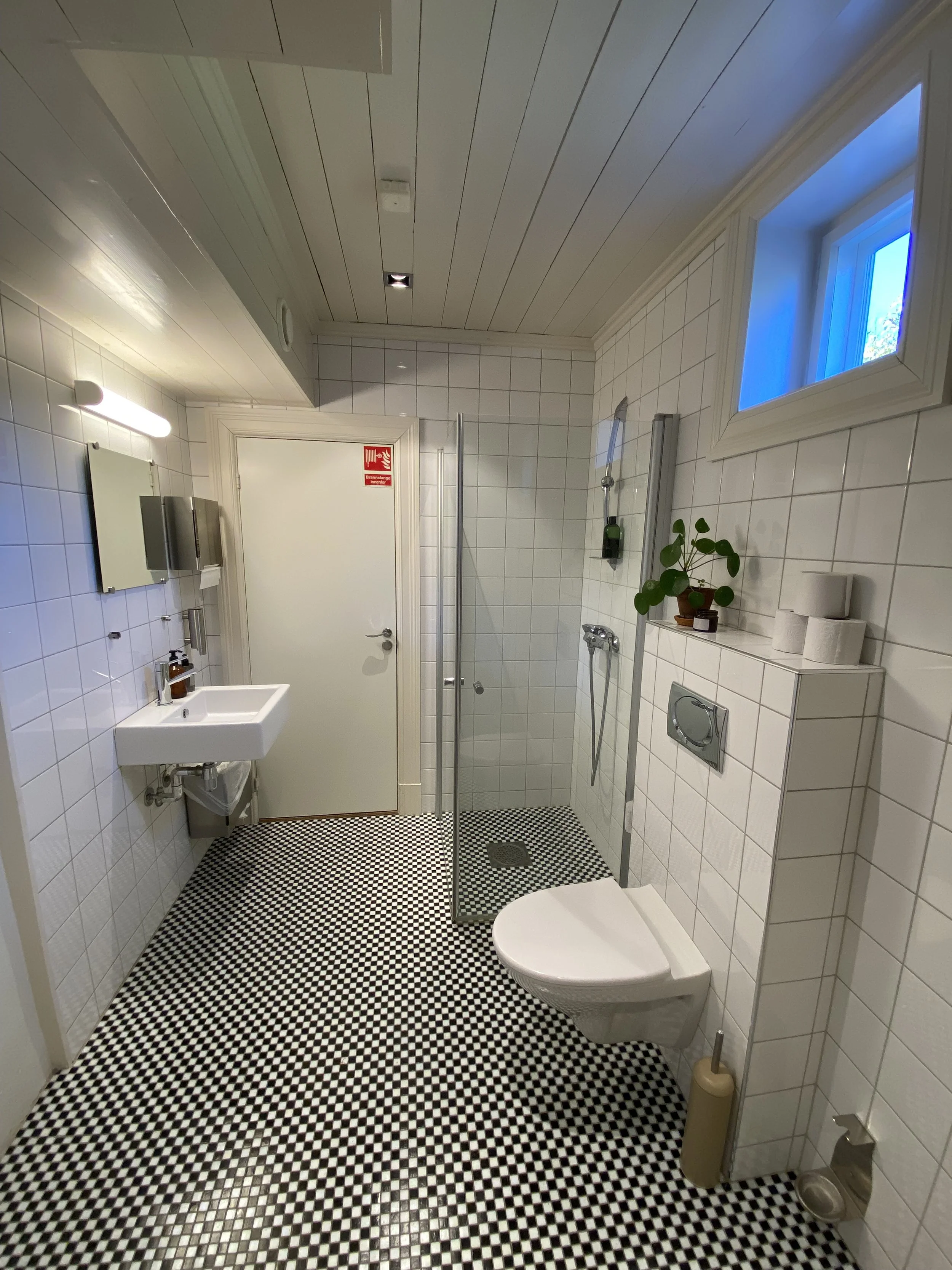 I første etasje er det et romslig kjøkken med komfyr, to kokeplater, vask, oppvaskmaskin og kjøleskap/fryser. Det er også et romslig bad med vask, WC og dusj.